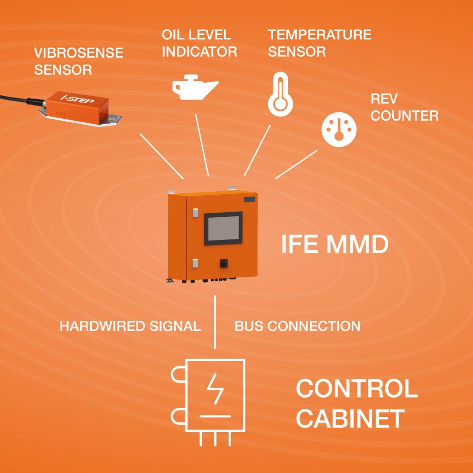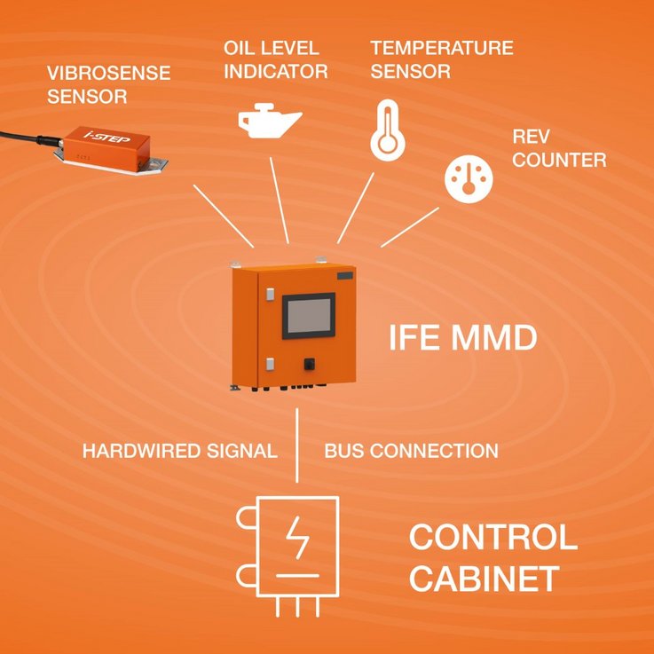 IFE offers a range of powerful solutions for machine monitoring. The Machine Monitoring Device (MMD) is supplied as a complete control cabinet including its own PLC and enables the integration of a wide variety of sensors (e.g., vibration, oil level, temperature, speed) directly into the control system via a data bus connection. This allows sensor data to be processed centrally and defined actions to be triggered – from visual warning messages to automatic shutdown when limit values are exceeded.