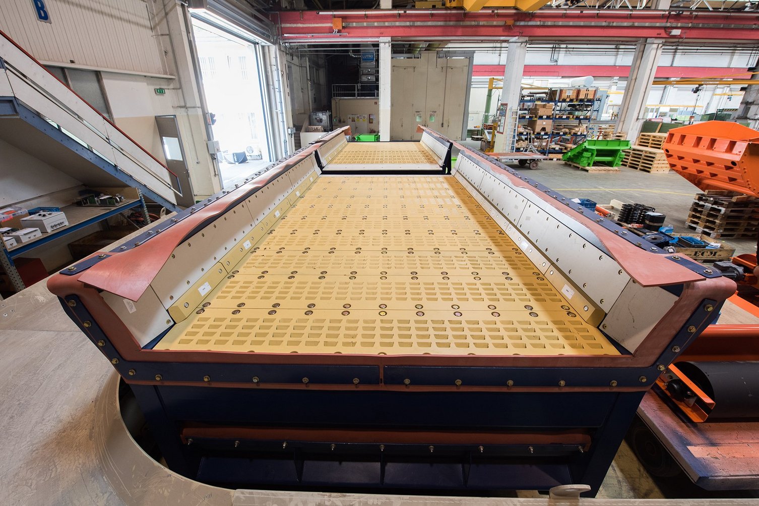 The sand lumps are effectively crushed and fall through the grate openings onto a lower sand conveyor section and are fed into the sand regeneration system as loose sand or crushed lumps. The casting is conveyed by the conveyor movement from the channel and transferred to the subsequent process steps “casting cooling and reading section.” The drive concept with an unbalanced cell and electronic control allows the oscillation angle of the machine to be varied. This allows the separation and conveying behavior to be adapted to different castings.